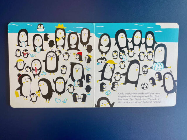 Dabei gibt es ein Hilfe: den Pinguin kann man ertasten, da er mit Stoff hinterlegt ist. Daher wird auf jeder Doppelseite aufgefordert:“ Such mal! Fühl mal!“ um den Pinguin in der großen Schar zu finden.