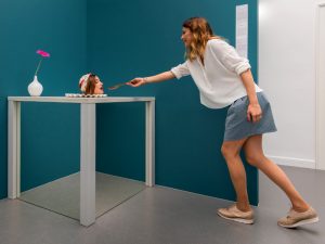machen. Das ist ja sonst in Museen eher selten. Besonders toll fanden wir den „Ames Raum“, den „unendlichen Raum“ und den „Kopf auf dem Präsentierteller“. Aber auch die gewöhnlichen Wahrnehmungstäuschungen haben mir gut gefallen, besonders, weil man sie gleich überprüfen kann. Nur im Vortext-Tunnel konnte ich mich nicht länger aufhalten, da wurde mir schummerig.