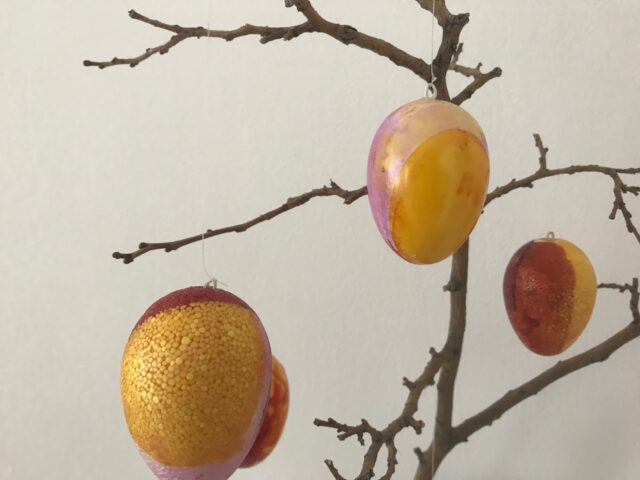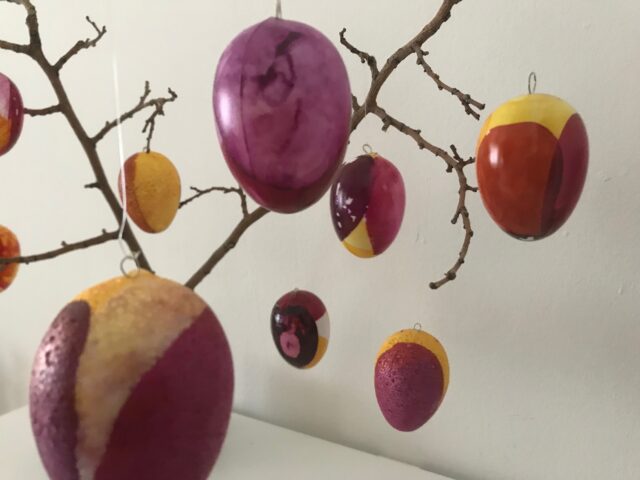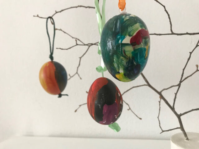 Darauf sind wir durch Zufall gekommen. Ich hatte Glasmalfarbe geerbt, die schon sehr lange herumstand und in Gefahr lief, auszutrocknen. Da sie einfach wunderschön leuchtet hatten wir die Idee, dies auf Eiern auszuprobieren. Wir haben die Farbe in kleine Behälter gelehrt und dann die Eier eingetaucht. Das ist eine ziemlich Farb-intensive Sache, daher würde ich eher Wasser- oder verdünnte Acrylfarben dafür empfehlen. Außerdem haben wir mit Styropor-Eiern experimentiert. Die Struktur des Styropors kommt dabei durch, aber ich finde es ist auch sehr nett geworden. Wir haben wie aufgehängt trockenen lassen, weil das liegende Ei sonst angeklebt wäre. Zum Aufhängen der Eier haben wir einen dünnen Draht genommen und so über eine Stricknadel gebogen, dass sich eine Schlaufe ergab. Diese Schlaufe steckten wir in die Eier und haben es mit der Heißklebepistole fixiert, damit er gut drinnen hält.