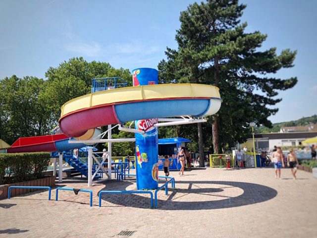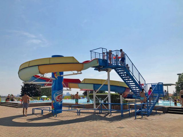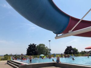 An heißen Sommertagen kann es hier schon einmal zugehen und auch bei der Rutsche kann es zu Wartezeiten kommen – Sonnenschutz nicht vergessen, denn Kinderbecken und Rutsche sind ohne Schatten!
