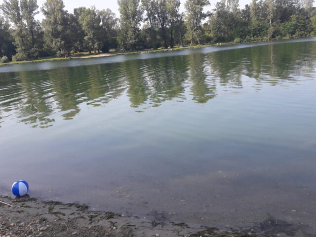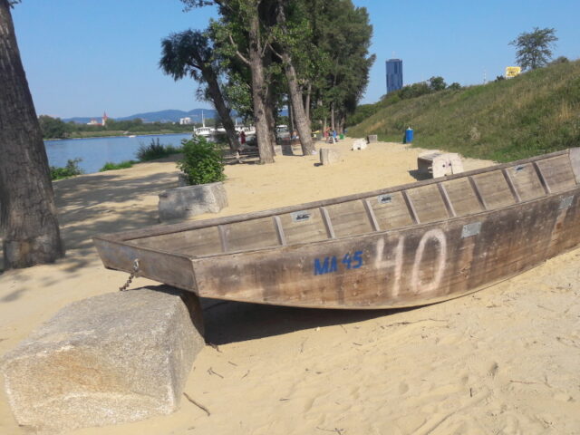 Durch den Sandstrand, die schattenspendenden Pappeln und die beiden Boote, die als Spiel- und Sitzgelegenheiten dienen, kommt automatisch so etwas wie Urlaubsfeeling auf. Die Kindern haben eines der Boote ausgiebig bespielt und ein wenig Sand gegraben, bevor sie sich ins Wasser gewagt haben.