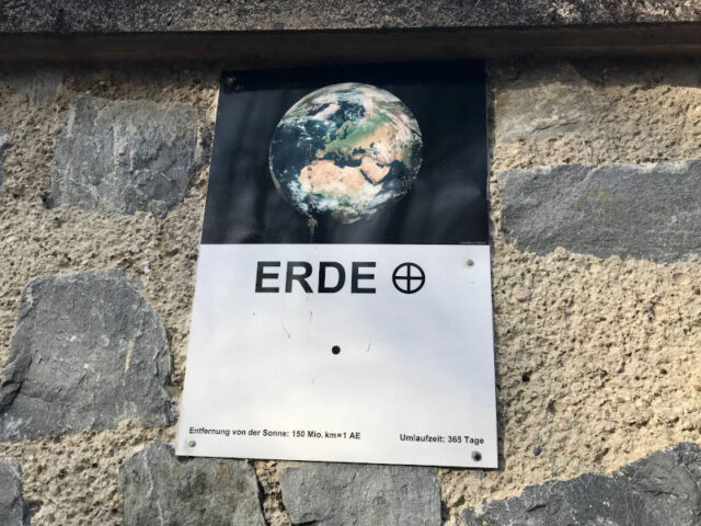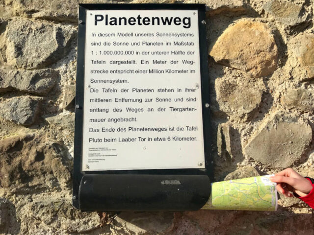 Ausgangspunkt ist natürlich die Sonne, alle Planeten sind in der Folge in ihrer Entfernung von ihr platziert. Auf den bunten Tafeln wird neben der Entfernung noch die Umlaufzeit angegeben. Außerdem ist die Größe abgebildet – die Erde ist grade einmal ein Punkt von ca zwei cm Durchmesser. 🙂
