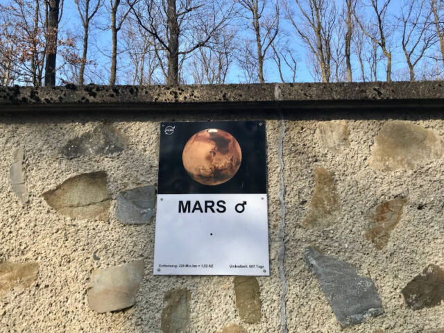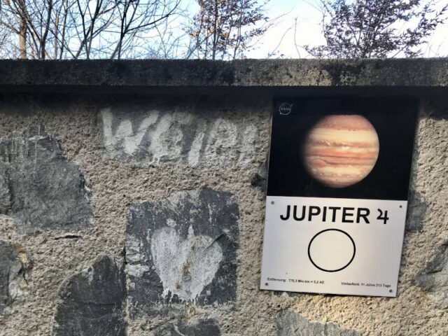 Dass das Universum mit seinen Planeten unglaublich groß ist, das wissen wir ja. Erfahren, ja erspüren kann man seine Größe, wenn man den Planetenwanderweg entlang der Mauer des Lainzer Tiergarten geht. Da kann es schon mal eine halbe Stunde dauern, bevor man auf die Tafel des nächsten Planeten stößt und das, obwohl man sich langsam gehend in dreifacher Lichtgeschwindigkeit durchs All bewegt.