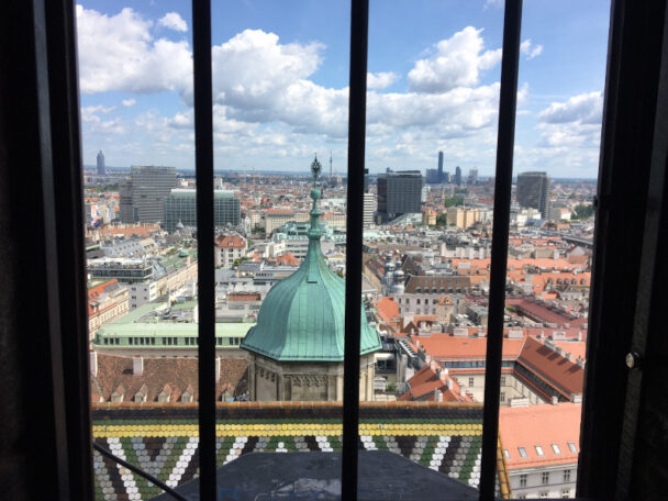 Im Unterschied zum Südturm ist man hier natürlich nicht ganz so hoch, dafür befindet sich die Aussichtsplattform an der frischen Luft und der Turm lässt sich fast gänzlich umrunden. Die Plattform ist freilich mit Gittern und Netzen abgesichert, trotzdem hat man eine fantastische Aussicht und einen guten Blick auf einen Teil des bunten Dachs des Stephansdoms. Ein weiteres Highlight ist die Pummerin. Mit ihren knapp 21 Tonnen und einem Durchmesser von 3,61 Metern ist sie die größte Glocke Österreichs und somit ziemlich beeindruckend.