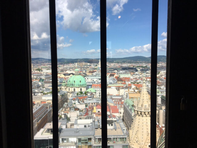 Die Treppe fühlt sich schon sehr eng an wenn man alleine geht, kommt dann aber Gegenverkehr wird es wirklich eng. Über 343 Stufen gelangt man in die Turmstube. Am Weg dorthin kann man auch einen Blick in die ehemalige Glockenstube werfen, dort war von 1711 bis zum Dombrand im April 1945 die alte Pummerin beheimatet. Der Aufstieg ist wirklich anstrengend, dafür wird man in der Turmstube mit einer tollen Aussicht über Wien belohnt.