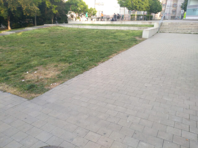 Auf der zweiten etwas höher gelegenen Ebene befinden sich mehrere Sitzgelegenheiten und Bank-Tisch-Kombinationen mit viel Abstand dazwischen. Riesige Silberlinden spenden Schatten. Außerdem gibt es einen Tischtennistisch, Trinkbrunnen und eine Hundezone.