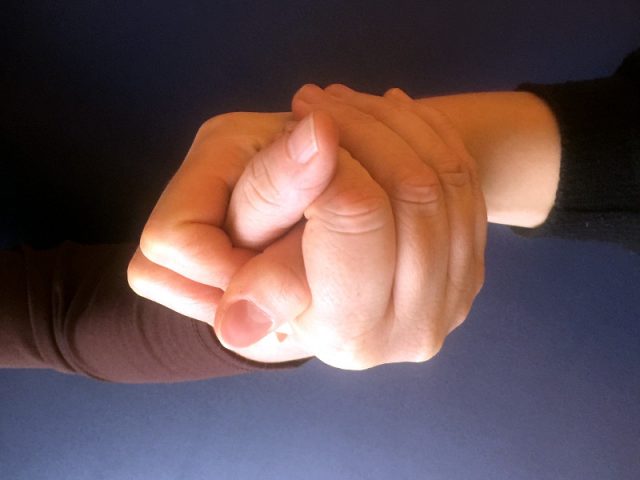 Auch hier sitzen oder stehen sich zwei Spieler_innen gegenüber und geben sich die Hand. Wie die Hände verschränkt werden sollen, seht ihr auf dem 1. Bild. Mit dem Spruch „Eins, zwei, drei, Daumenquetscherei“ versucht jede Spieler_in, den anderen Daumen hinunterzudrücken, während der_die Gegner_in versucht, dies nicht zuzulassen. Wer den Daumen des_der Mitspieler_in hinunterdrücken kann, hat gewonnen.