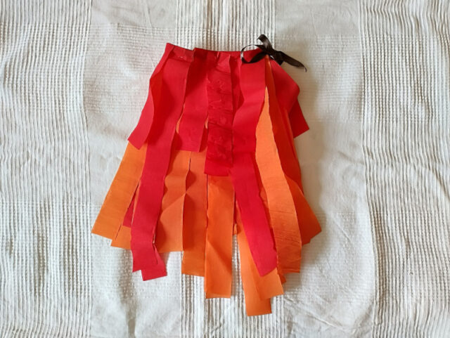 Ihre feuerroten Haare lassen sich leicht mit Krepppapier nachbasteln, und wenn man dann doch einen Rock tragen will, kann die „Perücke“ einfach um die Hüften gebunden werden. Dafür habe ich rote und orangene Streifen Krepppapier um ein Stoffband getackert. Ein Gummiband funktioniert auch genauso gut.