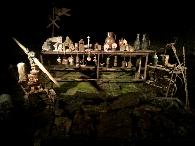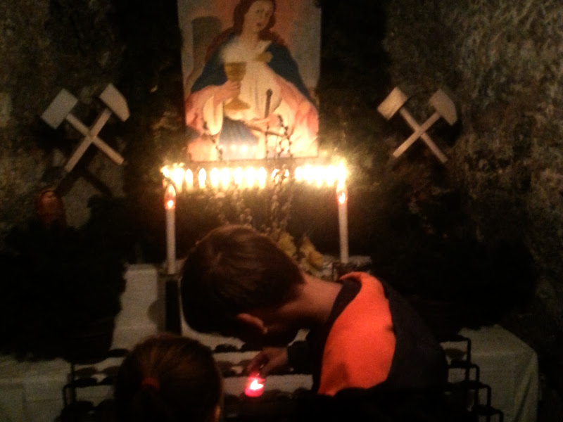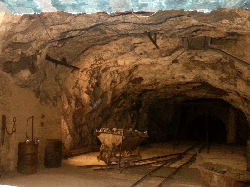 Nach einem langen Gang durch den Grottenschacht, bei dem große Menschen die Köpfe einziehen müssen und kleinen Menschen, wie meiner Tochter zuerst ein bisschen unheimlich zu Mute war, zeigte die Begleitperson uns unterschiedliche Exponate. Da sieht man Werkzeuge, nachgestellte Arbeitsszenen, Grubenponys und natürlich auch eine Barbara-Kapelle. Spannend für unsere größeren Kids waren die Erzählungen über den versteckten Flugzeugbau in der Grotte während des 2. Weltkrieges. Beeindruckend und sehr schön auch der kleine blaue See.
