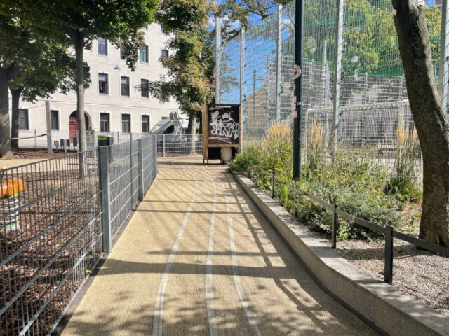 Am Rand ist noch ein cooles Kletter-Balance-Spielgerät mit Seilen und Holzelementen und außerhalb gibt es links und rechts einen Tischtennistisch. Neben dem Ballspielkäfig sind Fitnessgeräte inklusive Reckstangen und ein kleiner Fahrradweg führt rund um den Käfig herum.