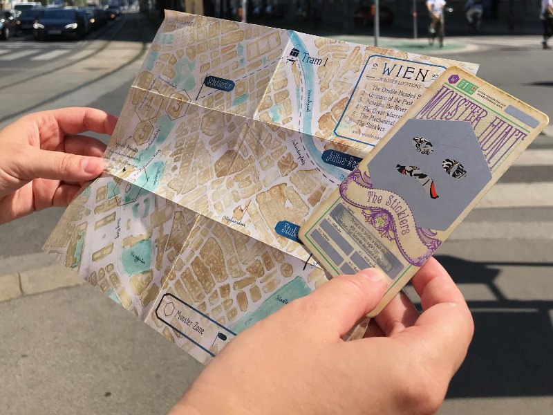 Monster Hunt bietet euch eine kleine Rätsel-Rallye, in der ihr in 1-2 Stunden „Monster“ finden und so vertreiben sollt. Diese Monster verstecken sich in Wien an verschiedenen öffentlichen Plätzen – auf Karten kriegt ihr zusätzliche Hinweise und Hintergrundinformationen zu den gesuchten Statuen oder Bildern. Auf der dazugehörigen Website findet ihr ergänzend historische Informationen zu den jeweiligen Sehenswürdigkeiten. Die Texte sind teilweise etwas lang und brauchen mehr Aufmerksamkeit, sind aber sehr schön geschrieben und beinhalten interessante Informationen zum historischen Kontext der jeweiligen Orte.