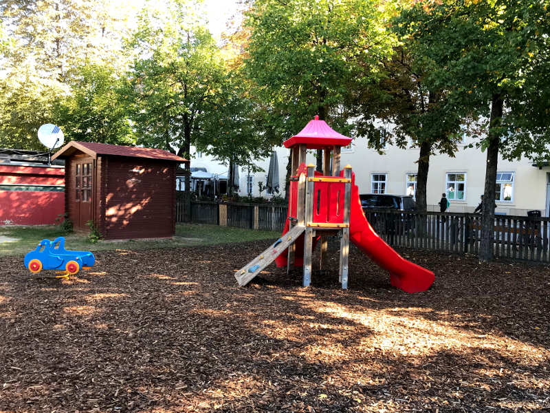Kleinkinderschaukeln, Wippauto und Wippelefant, sowie eine Kletter-Rutsch-Kombination bieten Kleinkindern Übungsmöglichkeiten. Die Sandkiste liegt mitten am Spielplatz, ist rund und offen. Aktuell ist sie nicht beschattet, aber die Pfosten rundherum weisen darauf hin, dass hier im Sommer ein Sonnensegel angebracht wird. Auch Wasser steht zur Verfügung, sodass die Kinder nach Herzenslust gatschen können.