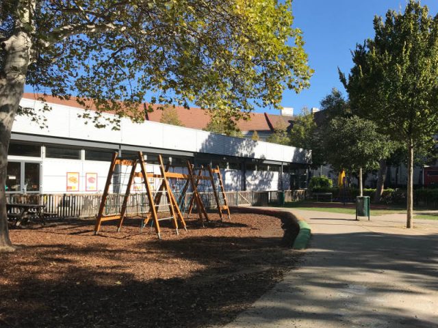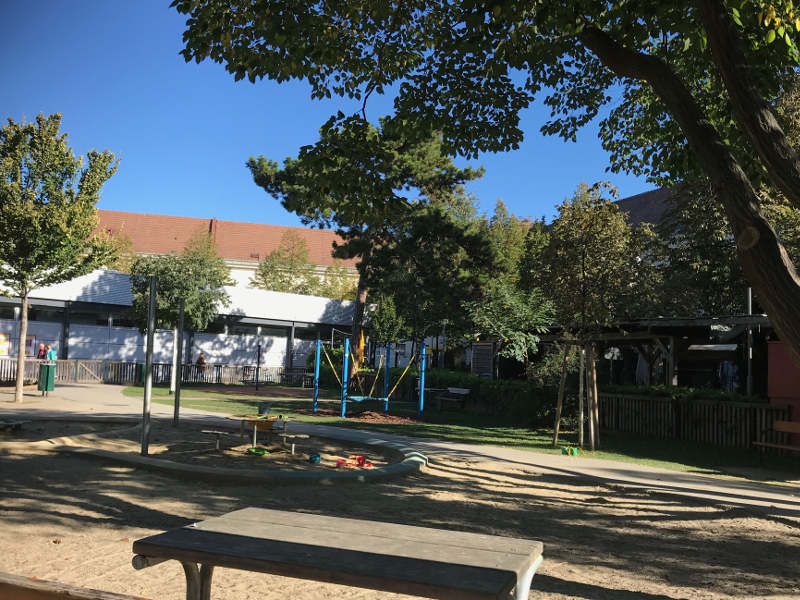 Der Spielplatz ist besonders reizvoll, da im ersten Hof des Campusgelände viele alte Bäume stehen. Der gesamte Spielplatz ist eingezäunt, die einzelnen Spielbereiche sind innerhalb der Einzäunung. Direkt neben dem Spielplatz ist ein Supermarkt, die Toiletten befinden sich gegenüber.