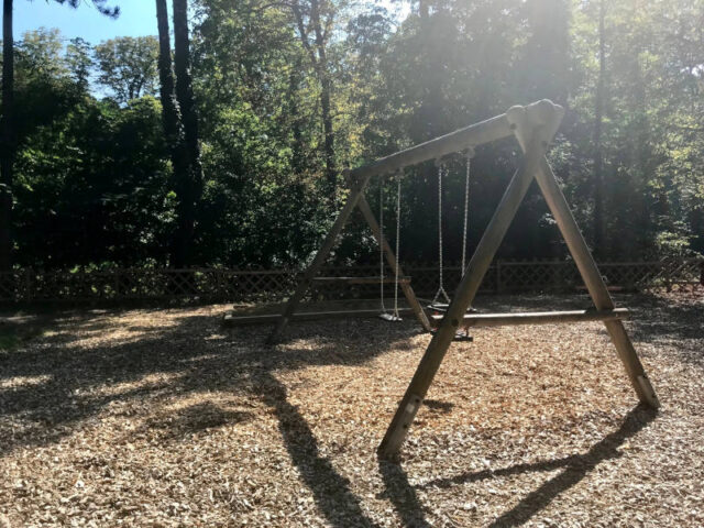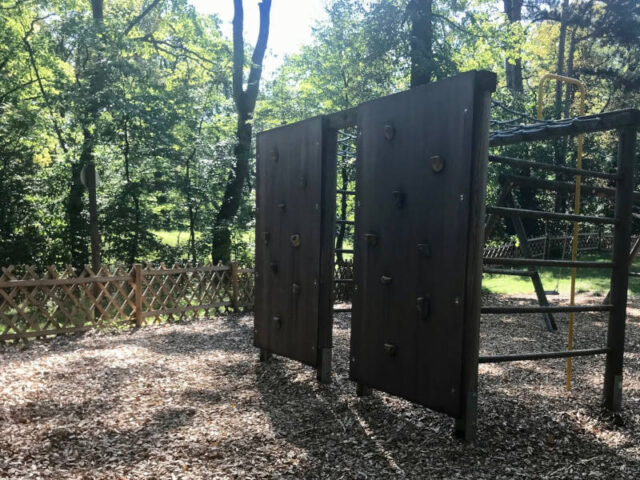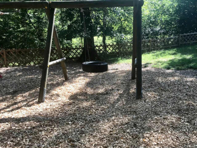 Ältere Kinder vergnügen sich auf den verschiedenen Schaukeln. Ein nettes Klettergerät mit Leiter, Netz, Bolderwänden sowie ein paar Reckstangen bieten noch mehr Spielmöglichkeiten für sie.
