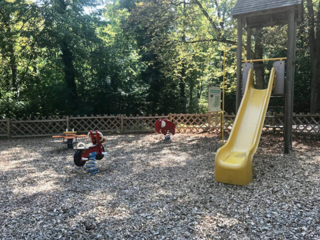 Der Spielplatz liegt gegenüber vom Gasthaus zur Schießstätte. Er gehört nicht zum Gasthaus und ist vom Gastgarten aus auch nicht einsichtig. Dafür ist der Spielplatz eingezäunt. Er ist eher klein, übersichtlich, und zur Gänze auf Rindenmulch angelegt. Natürlich gibt es auch eine Sitz-Bank-Kombi, Trinkbrunnen oder Toilette habe ich hier aber keine gesehen.