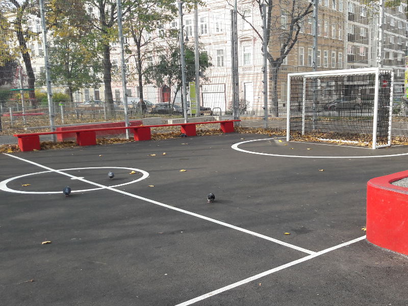 Außerdem gibt es noch Tischtennistische, einen Basketballkäfig und einen Fußballkäfig mit Toren sowie viele Sitzmöglichkeiten rund um die Käfige.