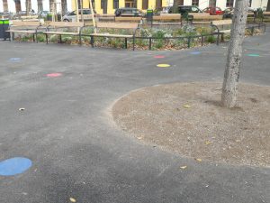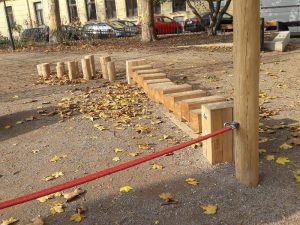 Darüber hinaus gibt es in einem Teil des Parks bunte Punkte am Boden. Kinder nutzen sie für unterschiedliche Hüpfspiele oder als Leo beim Fangenspielen. Meine beiden Mädchen mögen die Slackline und Wackelbrücke besonders gern.