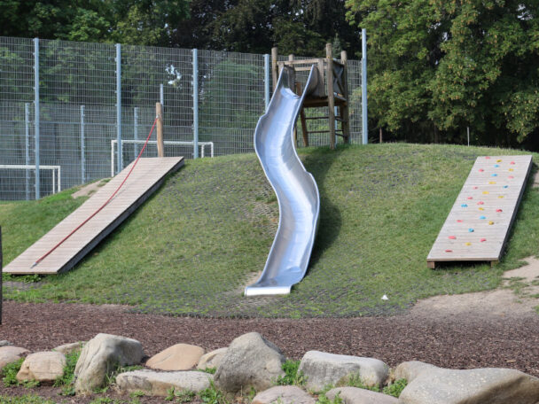 Besonders beliebt – zumindest bei meinen Kindern – sind auch das kleine Trampolin und die schräge Kletterwand bei der großen, silbernen Rutsche. Neben den Spielgeräten gibt es auch einen Fußballkäfig, Basketballkorb, Skatemöglichkeiten und einen Beachvolleyballplatz.
