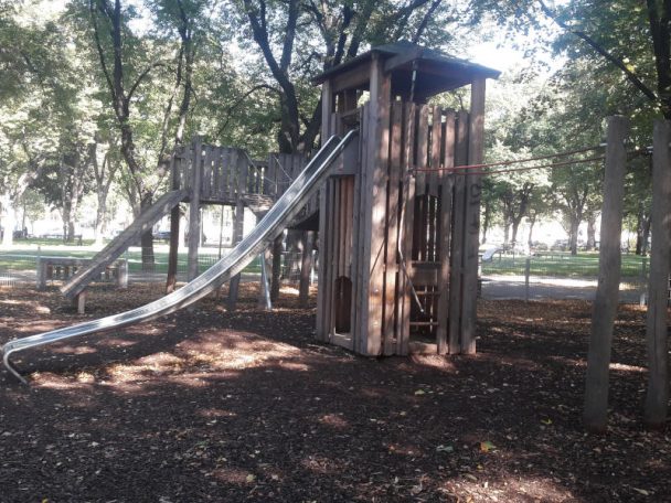 Ein Spielplatz bzw. Park, der für unterschiedliche Altersgruppen etwas zu bieten hat. Der Spielplatz ist eingezäunt, so dass es Eltern leichter fällt die Rasselbande zusammenzuhalten. Die Sportgeräte befinden sich im ganzen Park verteilt, aber Teens brauchen auch mehr Freiräume als die Kleinen. Toll finde ich, dass Kinder und Jugendliche zu bestimmten Öffnungszeiten die Jugendsportanlage mitbenutzen können. Sehr angenehm ist auch, dass sie die Hundebezitzer_innen an das Hundeverbot halten, zumindest auf dem Spielplatz.