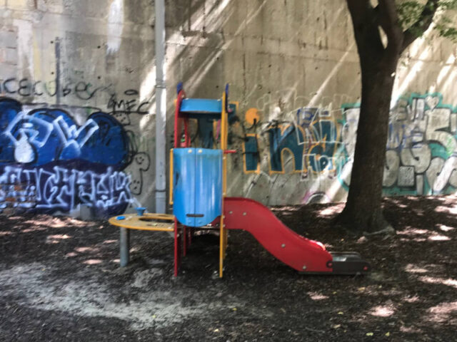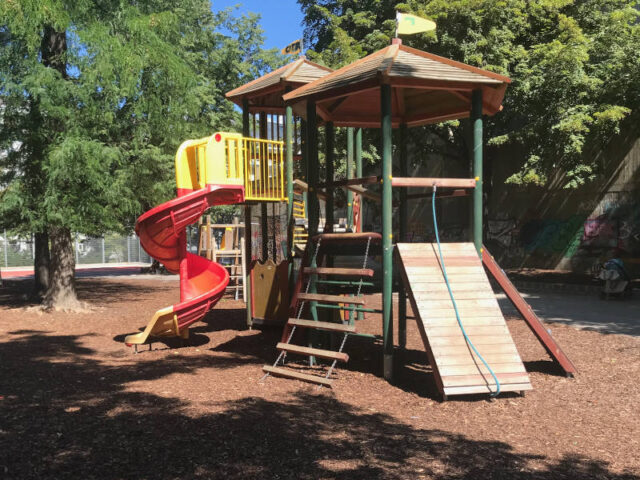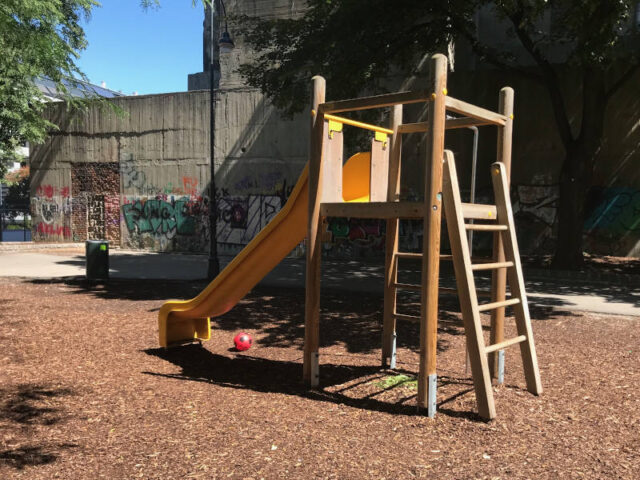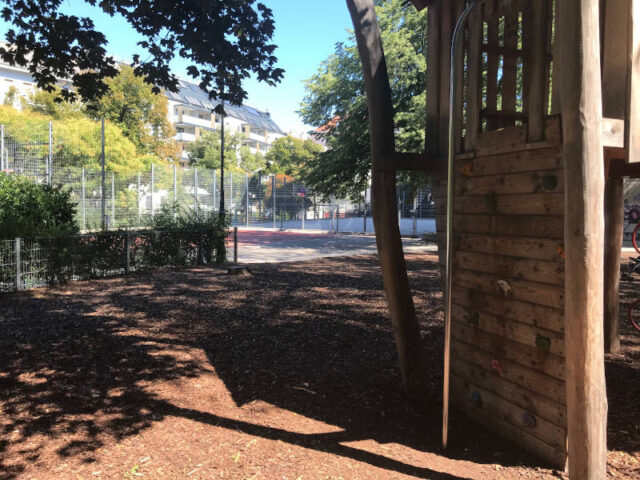 Hier gibt’s viele Klettermöglichkeiten: Neben einer Kletterpyramide gibt es einen hohen Kletterturm mit Rutsche und Boulderaufstieg sowie Schaukeln. Weiter hinten lädt ein Ballkäfig mit Toren und Basketballkorb die größeren Kinder zum Spielen ein.