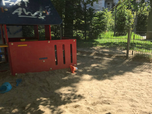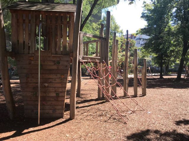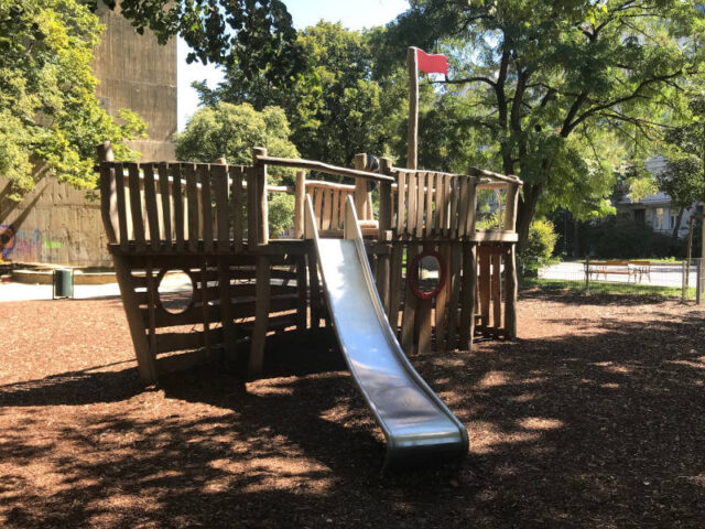 Das gestrandete Piratenboot ist die Attraktion: schön gestaltet und ebenerdig bespielbar, lädt es schon die jüngsten Besucher_innen zu fantasievollen Spielen ein. Eine große Sandkiste mit Spielhäuschen, eine Nestschaukel und Klettergeräte mit Rutsche sorgen für spielerische Anregungen.