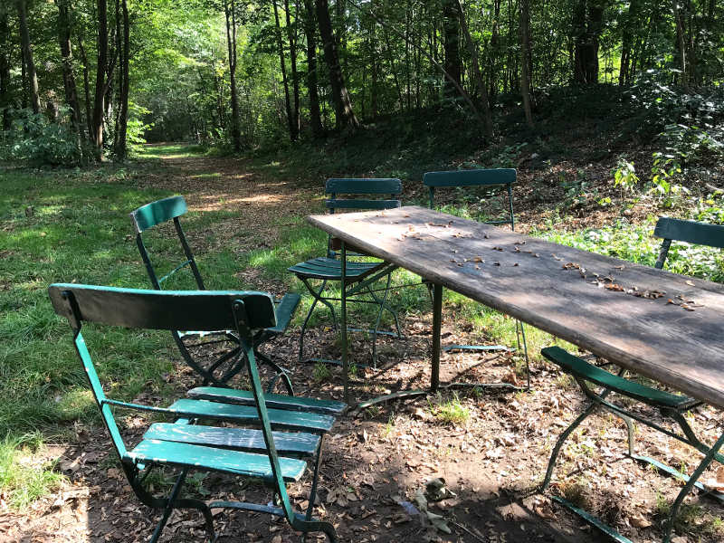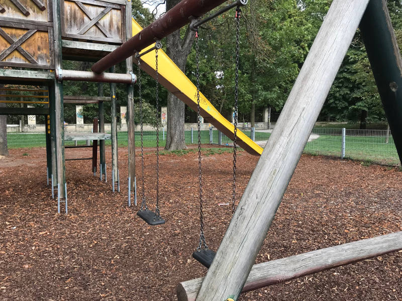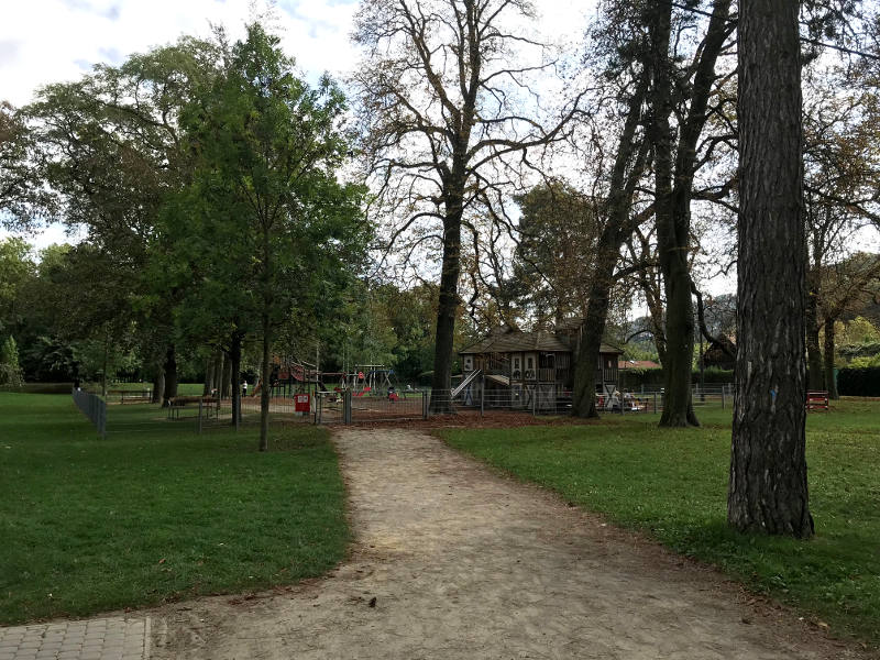 Vor kurzem hatte ich eine Fortbildung im Europahaus. In der Mittagspause waren wir im Park spazieren. Es war einer dieser herrlichen Herbsttage. Zwei Frauen übten Yoga auf der Wiese, andere saßen auf den verstreuten Sesseln oder lagen unter einem Baum. Die Allee dort ist etwas Besonderes, aber ich hab mir nicht gemerkt wie alt die Bäume sind. Überhaupt sind dort viele große beeindruckende Bäume, einfach eine feine Stimmung. Beim Herumspazieren haben wir den Spielplatz entdeckt. Der ist am unteren Ende des Parks, schon hinter der Parkmauer. Eine Freundin hat mir erzählt, dass sie oft dort waren, weil er meist wenig bespielt ist.