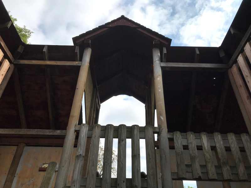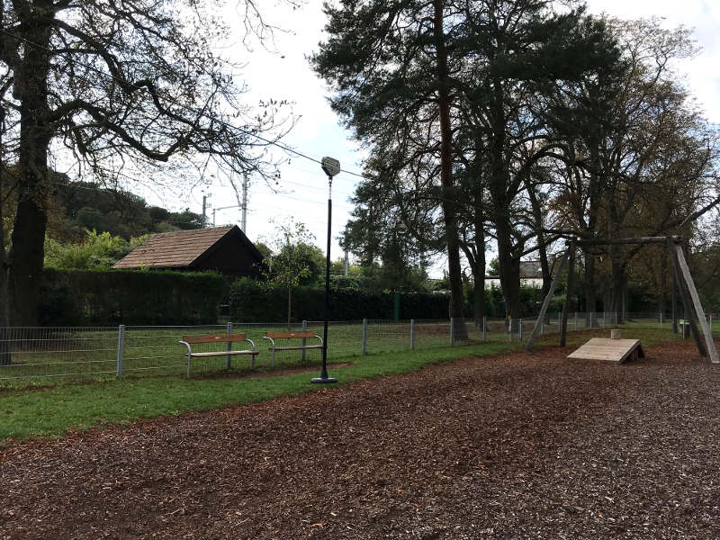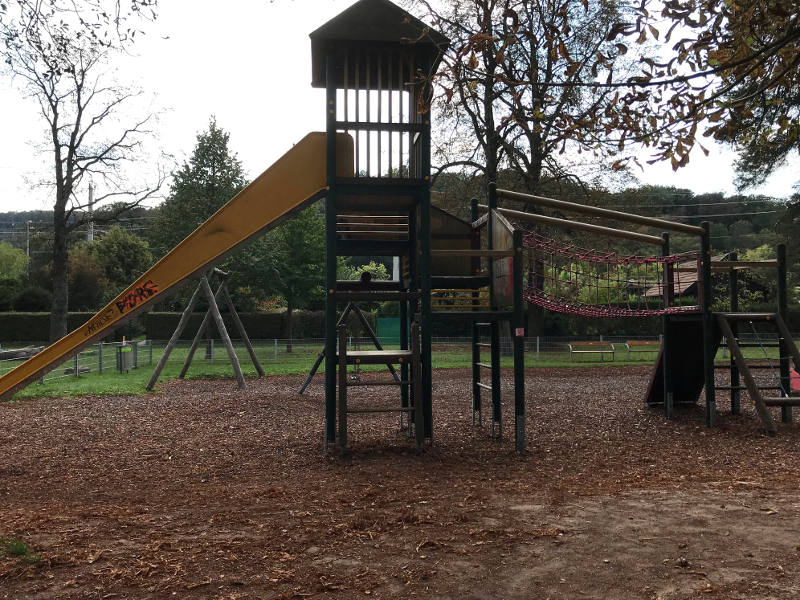 Der Spielplatz liegt auf einer Wiese mit einzelnen großen Bäumen und wirkt daher richtig weitläufig. Er ist eingezäunt, gut überschaubar und bietet rundherum Blick auf Wälder. Ich finde, es ist für alle Altersgruppen etwas dabei: Sandkiste, Wipptiere und Kleinkindschaukeln für die Jüngeren, außerdem liegen große Bäume auf der Wiese, die zum Klettern und balancieren einladen. Für die größeren Kinder eignet sich der Kletterturm mit Rutsche, eine Seilbahn und natürlich die Wiese zum Fußballspielen, die außerhalb der Einzäunung liegt.