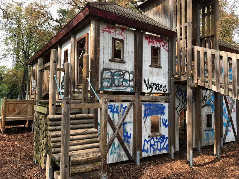 Die Bemalung des Spielhauses, das einen netten Innenhof hat, kam bei einigen Kolleg_innen nicht so gut an. Wie es mit Schatten aussieht, kann ich leider auch nicht sagen. Außerdem kann es je nach Wind sein, dass trotz viel Natur rundherum der Straßenlärm der Hadikgasse herübergetragen wird.