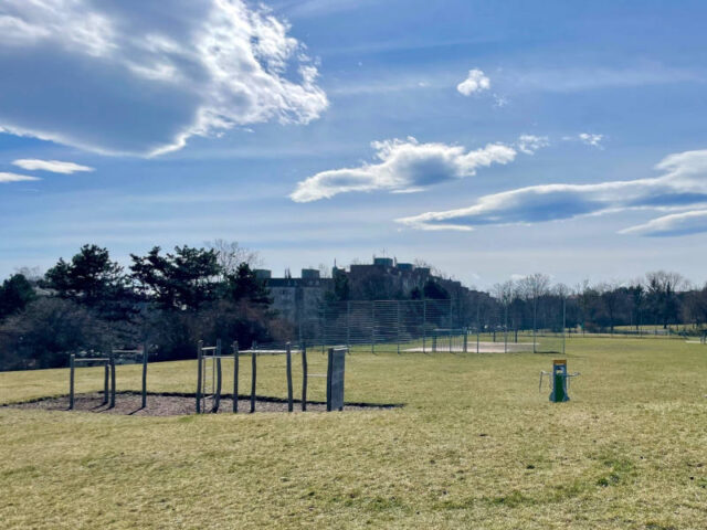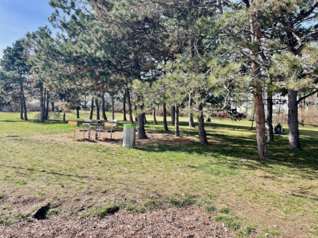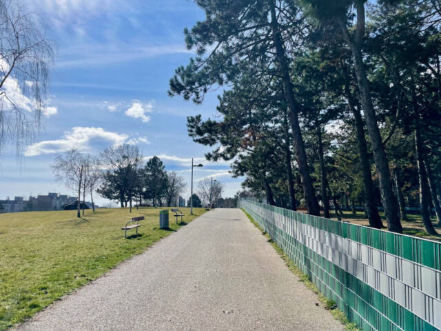 Wenn man von der Rudolf-Zeller-Gasse kommt, empfangen einen die weitläufigen Wiesenflächen – flankiert von Föhrenwäldchen – mit Kletteranlage und Fitnessgeräten von Free Gym. Auch das Fridtjof Nansen Denkmal ist hier gut sichtbar.