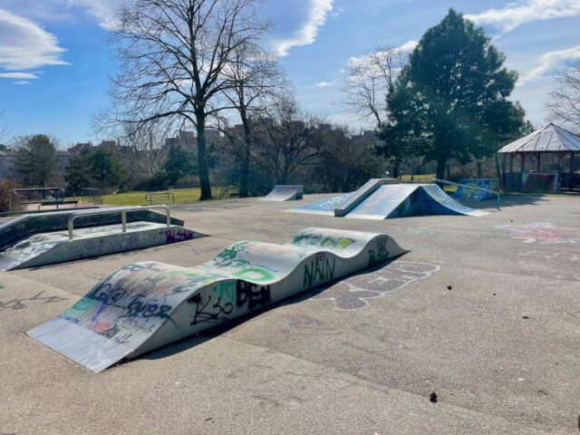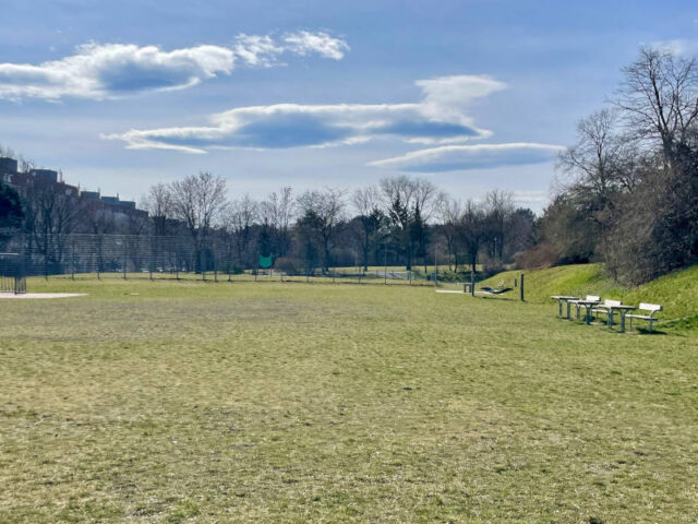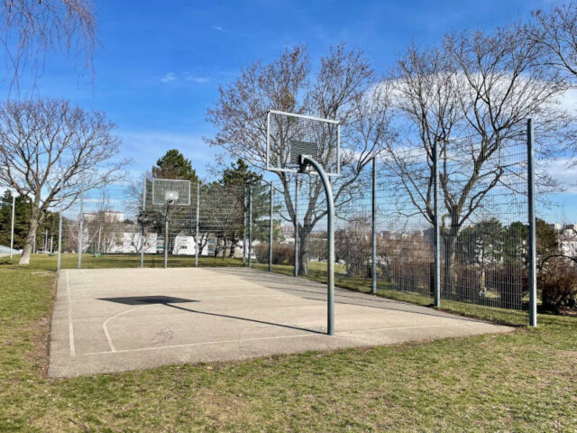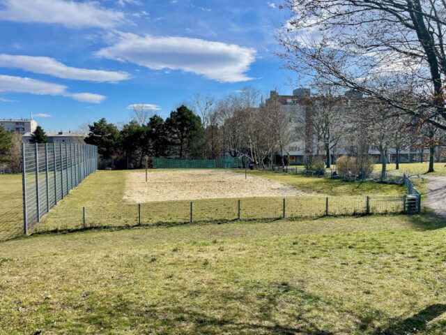Daneben liegt auf der linken Seite erst ein Basketballplatz und dahinter eine Skateranlage, die große Halfpipe ist aber ein bisschen weiter vorne rechts vom Weg. Wenn man hier ein bisschen weiter nach vorn, Richtung Abhang geht, sieht man den Fußballplatz, einen Beachvolleyballplatz und einen Tischtennistisch unten auf der Wiese. Eine Holzstiege führt hinunter, weiter hinten im Park gibt es auch einen befestigten Weg.