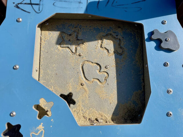 Doch das Highlight hier ist die Sandspielanlage, die mit mehreren Kübeln, Rohren und Tastspielmöglichkeiten versehen ist. Obwohl sie nicht hoch ist, kann sie über ein Netz, eine Stiege oder eine Schrägwand mit Seil erobert werden.