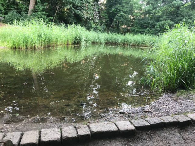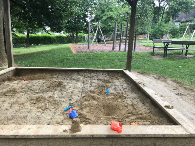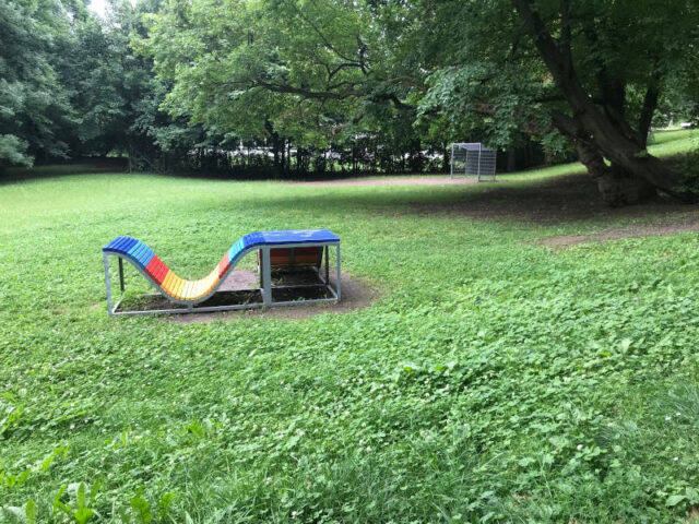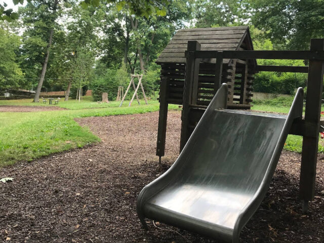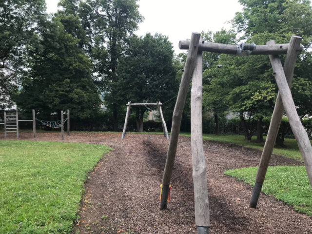 Die Spielgeräte findet ihr im oberen Bereich beim Eingang Erzbischofgasse. Sie sind auf der Wiese und darauf angebrachtem Rindenmulch verstreut und nicht separat eingezäunt. Der Teich weiter unten ist zwar idyllisch, aber nicht wirklich fürs Spielen gedacht.