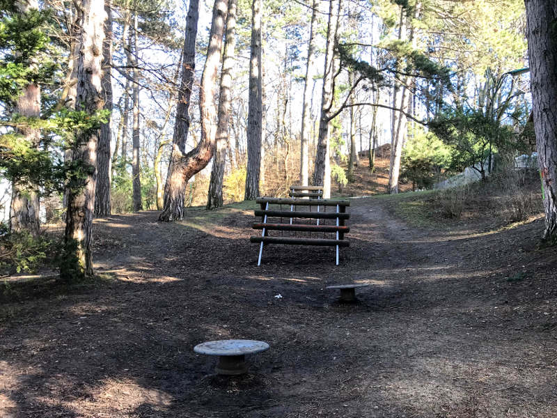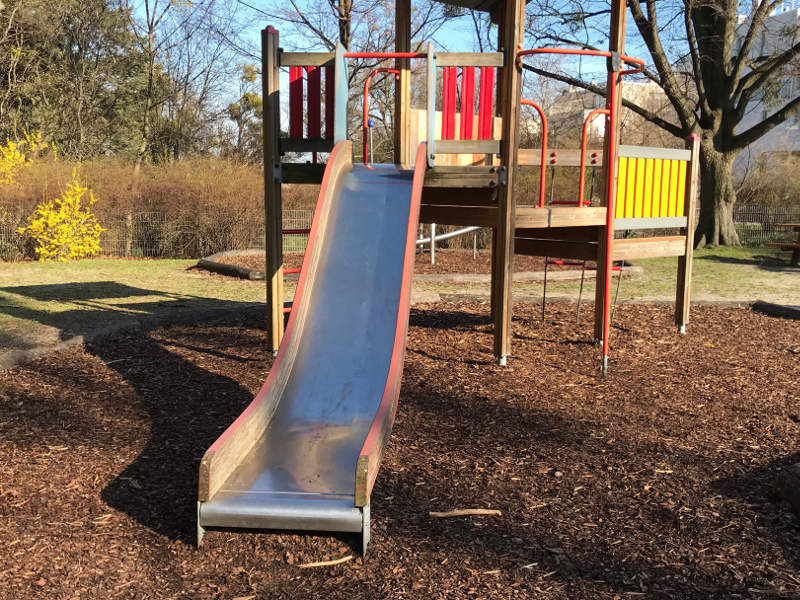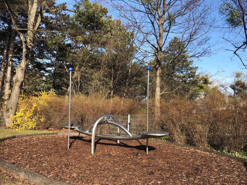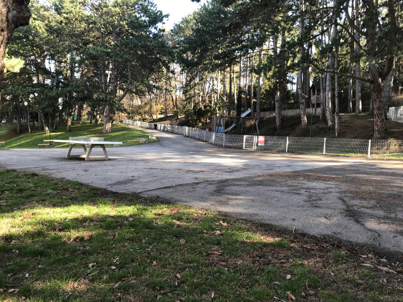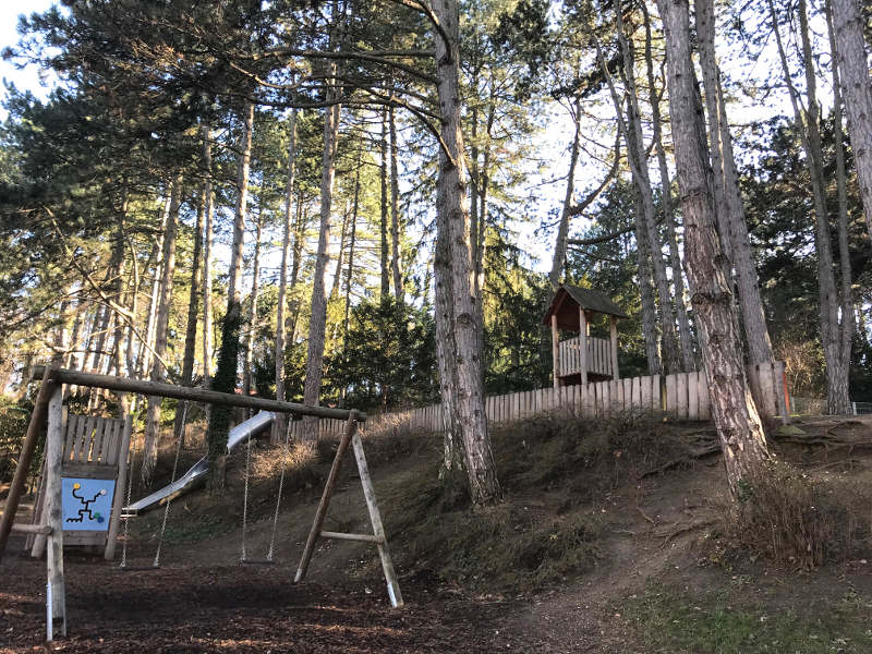 Dieser Spielplatz liegt schattig unter Kiefern ganz in der Nähe der Straße, und da er am Hang liegt, zeichnet er sich durch zwei Ebenen aus: Unten sind Schaukeln, auch Kleinkinder geeignet, eine Sandkiste und Wippgeräte, oben ist ein Kletterturm, der Eingang in die Rutsche und sowie Balance-Elemente. Auch kleine Kletterelemente könnt ihr dort erkunden, die ich anderswo noch nicht gesehen habe. Der Spielplatz ist eingezäunt und vor dem Spielplatz steht ein Tischtennistisch.
