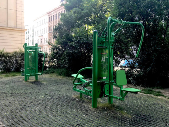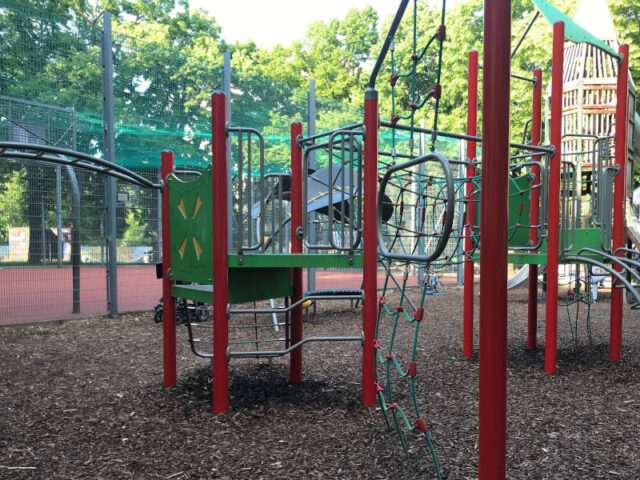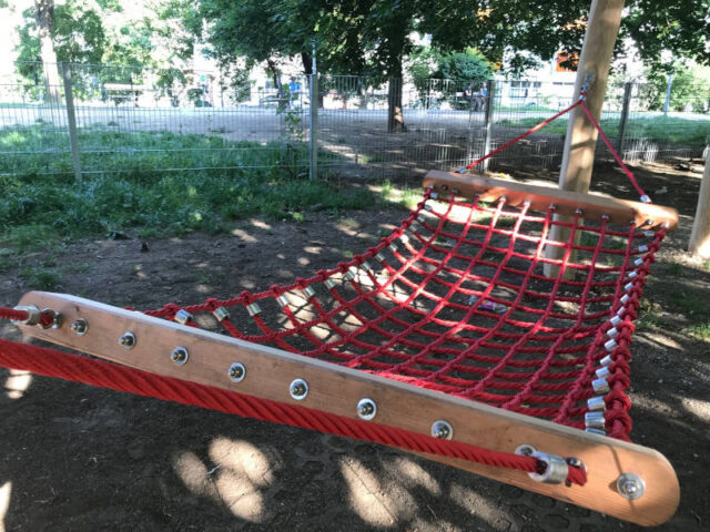 Als wir dort waren, wurden gerade zwei Hängematten errichtet. Ansonsten dominiert ein Ballspielkäfig in dem es Baskettballkörbe und Fußballtore gibt, den mittleren Bereich. Daneben sind Fitnessgeräte für die Sportlichen zu finden.