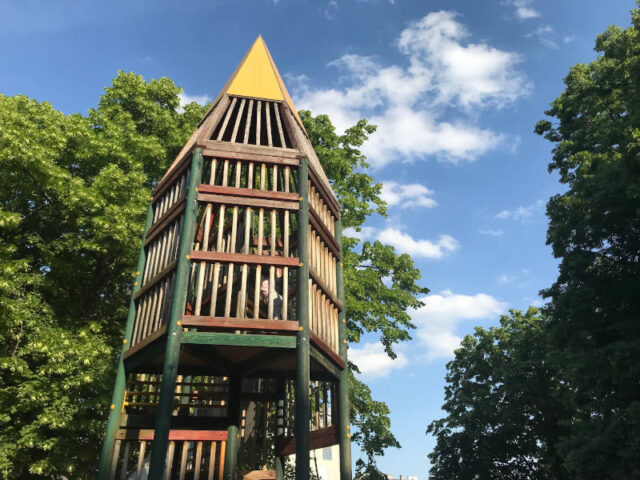 Der Spielplatz wird von einem hohen Turm mit geschlossener Rutsche dominiert wird. Aber auch ein futuristsich anmutendes Klettergerät bietet vielfältige Klettererfahrungen und lädt zum Erkunden Neben der Nestschaukel stehen weitere Schaukeln und auch Reckstangen zum Spielen bereit.