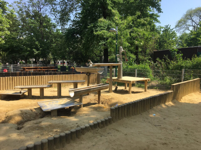 Für die Großen gibt es die schon erwähnte Wasserspielanlage. Hier kann man stundenlang spielen, das Wasser kann über mehrere Wege und Ebenen geleitet werden. Am Boden geht es dann mit dem Sandspielbereich weiter, hier kann man tolle Gruben und Dämme bauen. Außerdem gibt es noch Schaukeln, eine kleine Kletterwand und eine Kletterstange, sowie Ringe (in Dreiecksform). Zwei Klettergerüste, in verschiedenen Schwierigkeitsgraden und mit Rutschen, runden das Angebot ab.