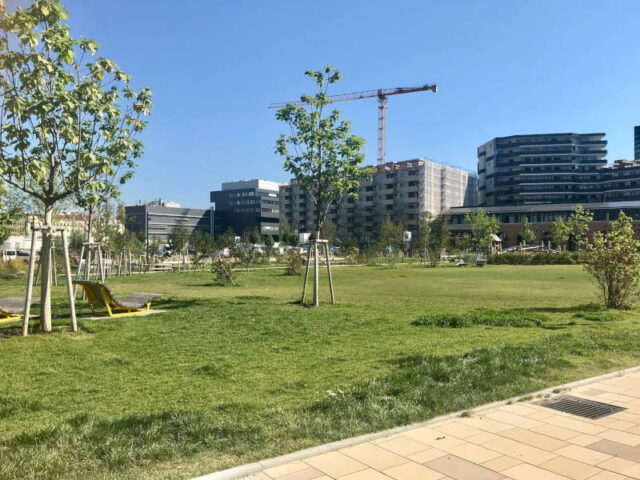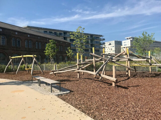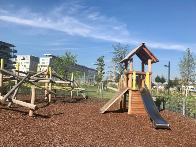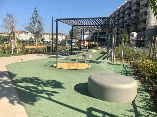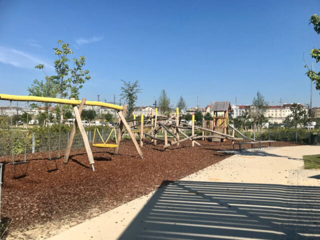 Auch wenn rund herum noch einiges im Bau ist, so ist der Spielplatz dort wirklich fein und der Park hat für alle Altersgruppen etwas zu bieten. Außerdem liegt er direkt am Radweg, der hier super ausgebaut wurde.