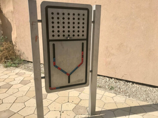 Auf dem Spielplatz gibt es auch ein Klettergerät und direkt nebenan steht ein Tischtennistisch und Sitzgelegenheiten im Schatten. Erst nachher habe ich gelesen, dass dort an 2 Pergolen Solarmodule angebracht wurden um über frei zugängliche USB-Ports elektronische Geräte aufgeladen zu können.