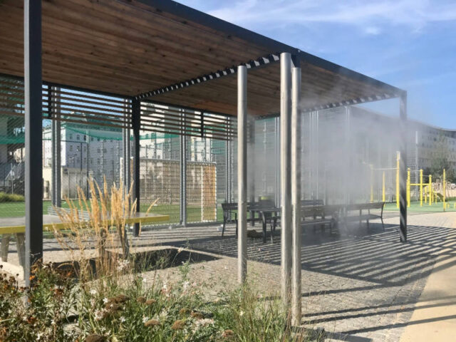 Auch für Abkühlung ist gesorgt, denn obwohl die kleinen Bäume noch nicht viel Schatten geben, beschatten 2 Pergolas. Außerdem sorgen 12 Nebelstelen sowie 2 Wasserspiele mit sprudelnden Boden-Wasserfontänen und Boden-Nebeldüsen für willkommene Abkühlung.