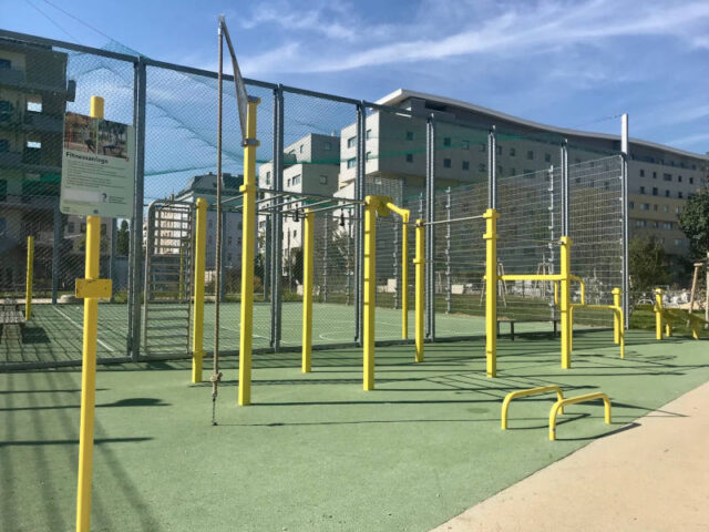 Die allerdings während der Betriebszeiten des Bildungscampus‘ vorrangig denen zur Verfügung stehen. Daneben sind Sprühnebelduschen und dahinter findet sich ein zweiter Tischtennistisch und sowie eine weitere Fitnessanlage, die ab einer Größe von 140 cm genutzt werden kann.