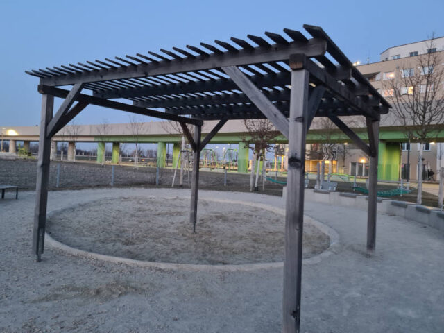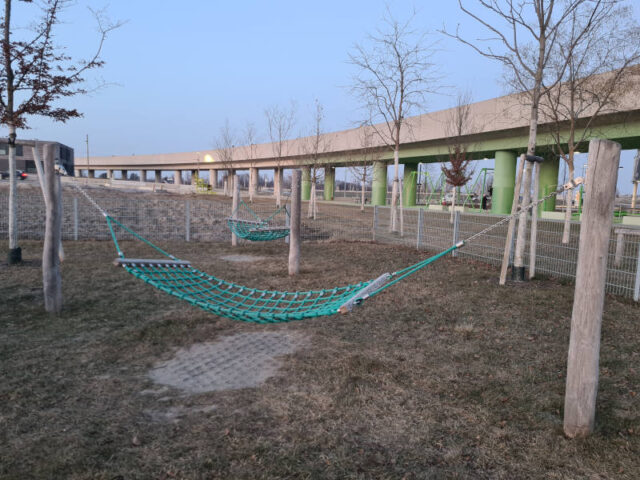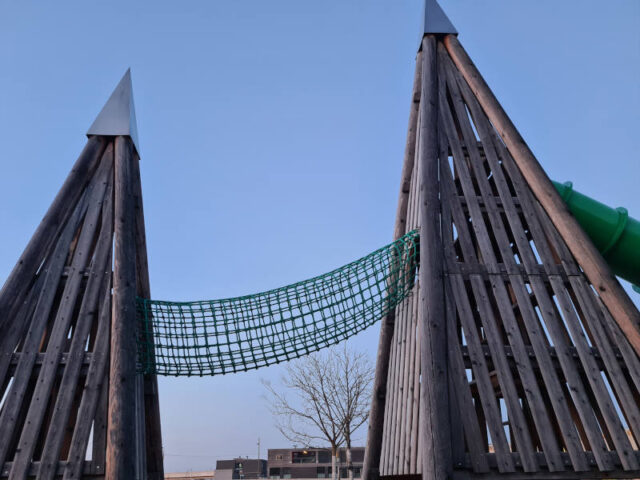 Weil die Tipis und die Rutsche ziemlich hoch sind, hat mich mein 8-jähriger Sohn zuerst eher unsicher gefragt, ob er auf die Tipis klettern soll. Dann hat er es probiert und sich richtig gefreut, dass er es geschafft hat. Zwischen zwei Tipis hängt weit oben eine Netzbrücke. Auch für diese Brücke kann für manche eine kleine Mutprobe sein. Durch die Brücke gelangt man zum nächsten Tipi, von dem eine lange Röhrenrutsche hinunter führt. Man muss aber nicht über die Brücke, um zur Rutsche rauf zu kommen. WCs und einen Trinkbrunnen haben wir leider nicht entdeckt.