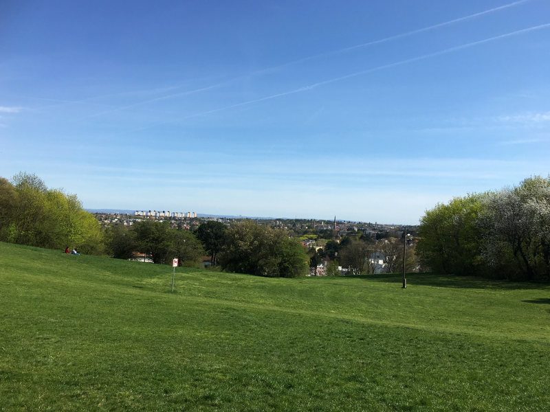 Er ist öffentlich gut zu erreichen und liegt auf einem Hügel, umgeben von Wiesen und am Waldrand. Wir sind über die Josef-Gangl-Gasse gekommen, die schon ein wenig aufwärts führt. Der Spielplatz liegt oben auf der Kuppe, was einen schönen Blick in beide Richtungen ermöglicht. Er ist nicht eingezäunt, wirkt ruhig und gemütlich mit seinen verstreuten Geräten. Schatten ist dort wenig, aber die Wiese lädt zum Picknicken und Sonnenbaden ein. Am Rand steht ein Mobilklo und auf der Wiese, in der Nähe des Klettergerüstes ist ein Trinkbrunnen aus dessen Abfluss auch die Hunde gern trinken. Als wir dort waren, liefen nämlich einige Hunde frei herum.