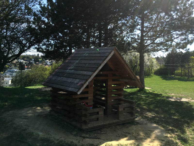 Am Waldrand steht ein kleines Spielhaus und eine Sandkiste liegt etwas abseits. Weiter hinten steht ein Karussell, Wippen und eine Kletter-Rutsch-Kombination. Hier am Waldesrand wurde ein Baumhaus aus Ästen gebaut – der Traum aller Kinder.