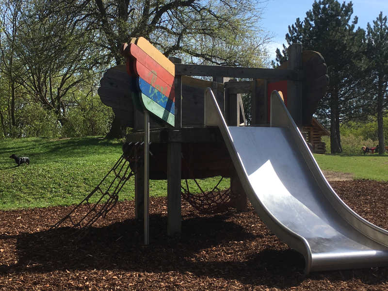 Wenn man sich dem Spielplatz nähert sticht einem zuerst eine große Kletter-Rutsch-Kombination ins Auge. Sie ist hoch und bietet auch für größere Kinder Herausforderungen. Natürlich gibt es dort auch Schaukeln, sowie ein Wackelband und die Wiese zum Ballspielen oder Rodeln im Winter. Ich habe auch einen Fußballplatz mit 2 Toren gesehen, der allerdings nicht eingezäunt ist.
