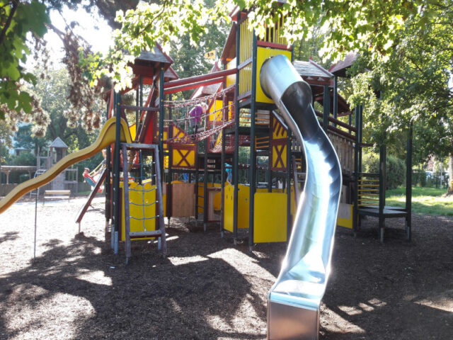 Das Hightlight ist sicherlich der große Kletterturm. Mit all seinen unterschiedlichen Balancier- und Klettermöglichkeiten plus den beiden großen Rutschen lädt er zum erkunden ein. Der Turm kann auf unzählige unterschiedliche Varianten erklommen werden und liegt teilweise im Schatten. Er eignet sich dadurch hervorragend zum Fangen spielen.