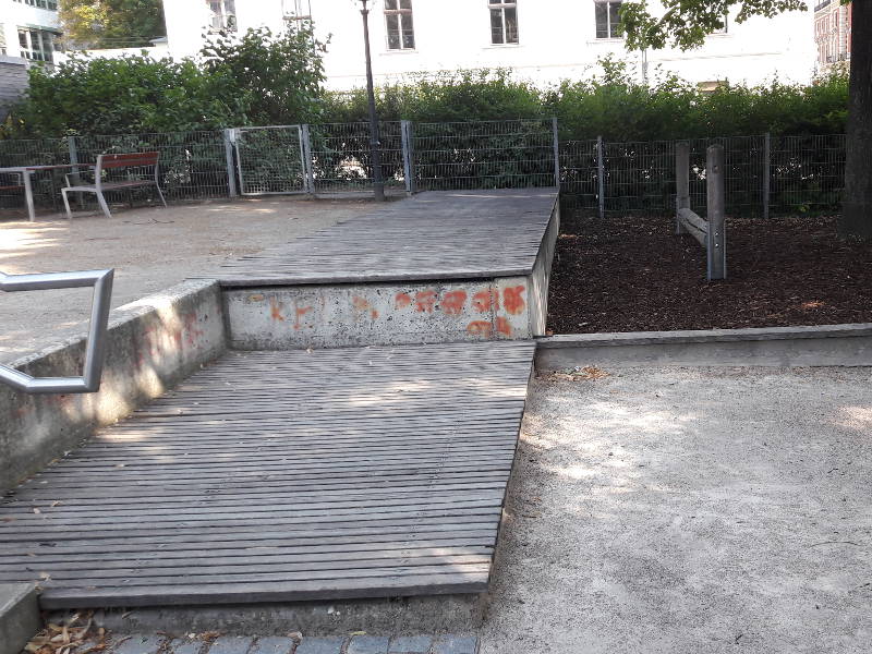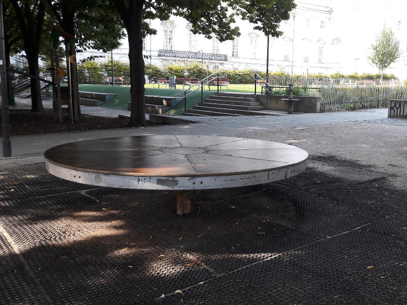 Außerdem lädt ein Karussell Rollstuhlfahrer_innen zur Benutzung ein. Es liegt gleich beim Eingang Museumsstraße auf Fallschutzboden und ist in den Boden eingelassen. Es ist breit genug, um mit einem Rollstuhl befahren werden zu können und bietet Platz für 2 Rollstühle. Ein Hebel, der bei Benutzung heruntergeklappt werden kann, sichert während dem munteren Drehen. Auf mehreren Spielplätzen in Wien gibt es Spielgeräte, die Rollstuhlfahrer_innen zur Benutzung einladen. Welche das sind, erfahrt ihr in unserer Broschüre Spielplätze und Ausflugstipps auf Seite 7.