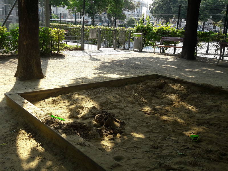Die Sandkiste ist groß und gut beschattet durch die großen Bäume. Überhaupt gibt es hier im Sommer viel Schatten. Für die erwachsenen Begleitpersonen sind die vielen unterschiedlichen Sitzgelegenheiten und die Übersichtlichkeit des Spielplatzes auch sehr praktisch. Wenn es für die Kinder passt, kann man sich einfach im Hintergrund halten und den Kindern etwas Spiel- und Freiraum lassen, da der Spielplatz so übersichtlich ist und genügend Sitzgelegenheiten am Rand bietet.