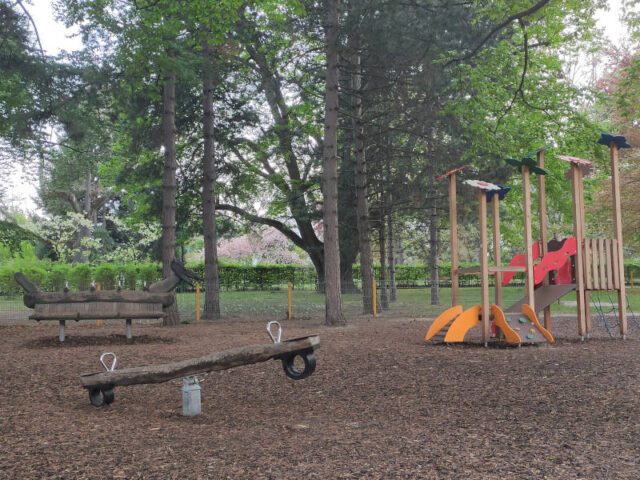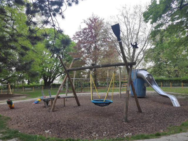 Rundherum gibt es einige Bänke für die Jause zwischendurch. Viele Bäume spenden Schatten und auch sonst gibt es einen großen Wiesenbereich außerhalb des Spielplatzes für diejenigen, die Ballspiele, Frisbee oder Fangen spielen möchten.