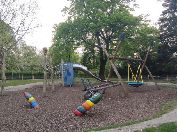 Der Spielplatz im Werktheimsteinpark liegt in Gürtelnähe und ist in meinen Augen aufgrund der Atmosphäre ein besonderer Spielplatz und einen Besuch wert. Der ganze Spielplatz ist eingezäunt und es gibt einen Bereich für die Jüngeren und einen für die Älteren zum Spielen.