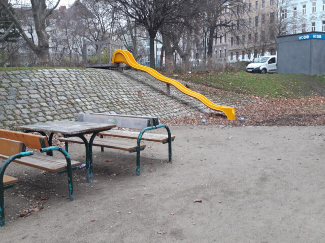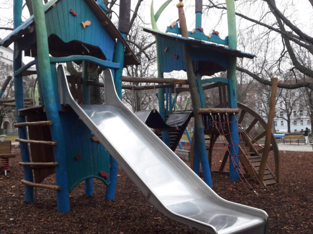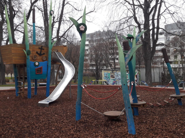 Wer hätte gedacht, dass Spielplätze im Dezember noch so interessant für uns sind! Meine Mädchen und ich haben dieses Jahr mehr Zeit als je zuvor auf Spielplätzen verbracht und viele neue Möglichkeiten in der Stadt erkundet. So sind wir auch auf diese Perle im Wilhemsdorferpark im 12. Bezirk gestoßen. Der Unterwasserspielplatz, so nennen ihn die beiden, ist durch das Angebot an Spielgeräten gerade für die Jahreszeit Winter noch interessant.